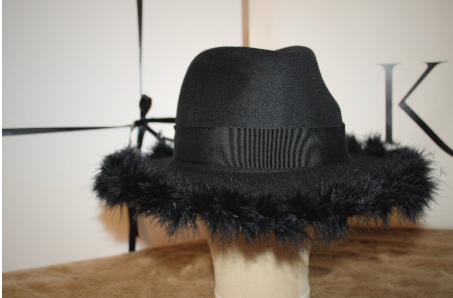 Chapeau Fedora noir, orné de plumes noires, son cordon gros-grain noir.