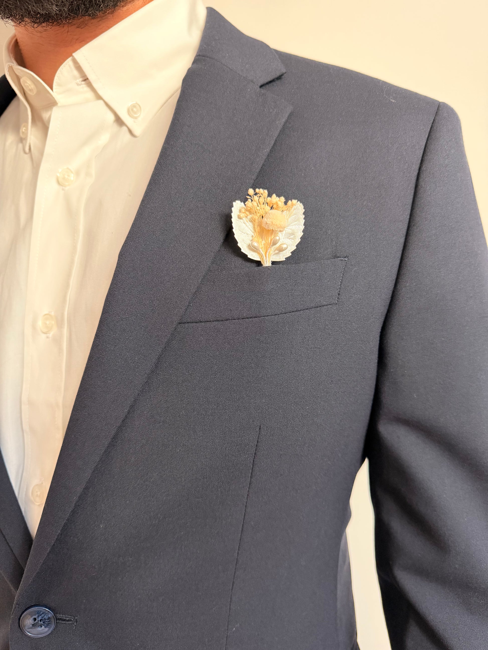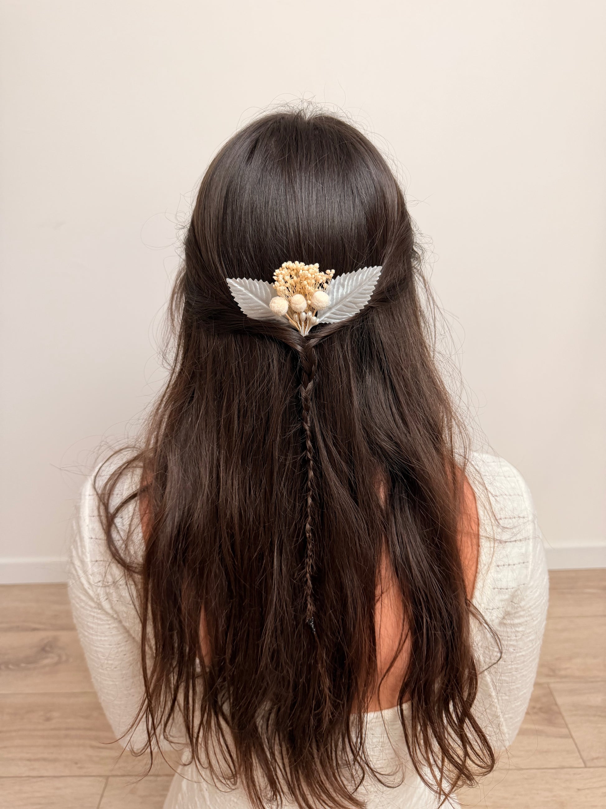 Le set comprend une broche à fixer dans le chignon de la mariée à l'aide de sa pince, ainsi que quatre boutonnières pour le marié et ses invités.